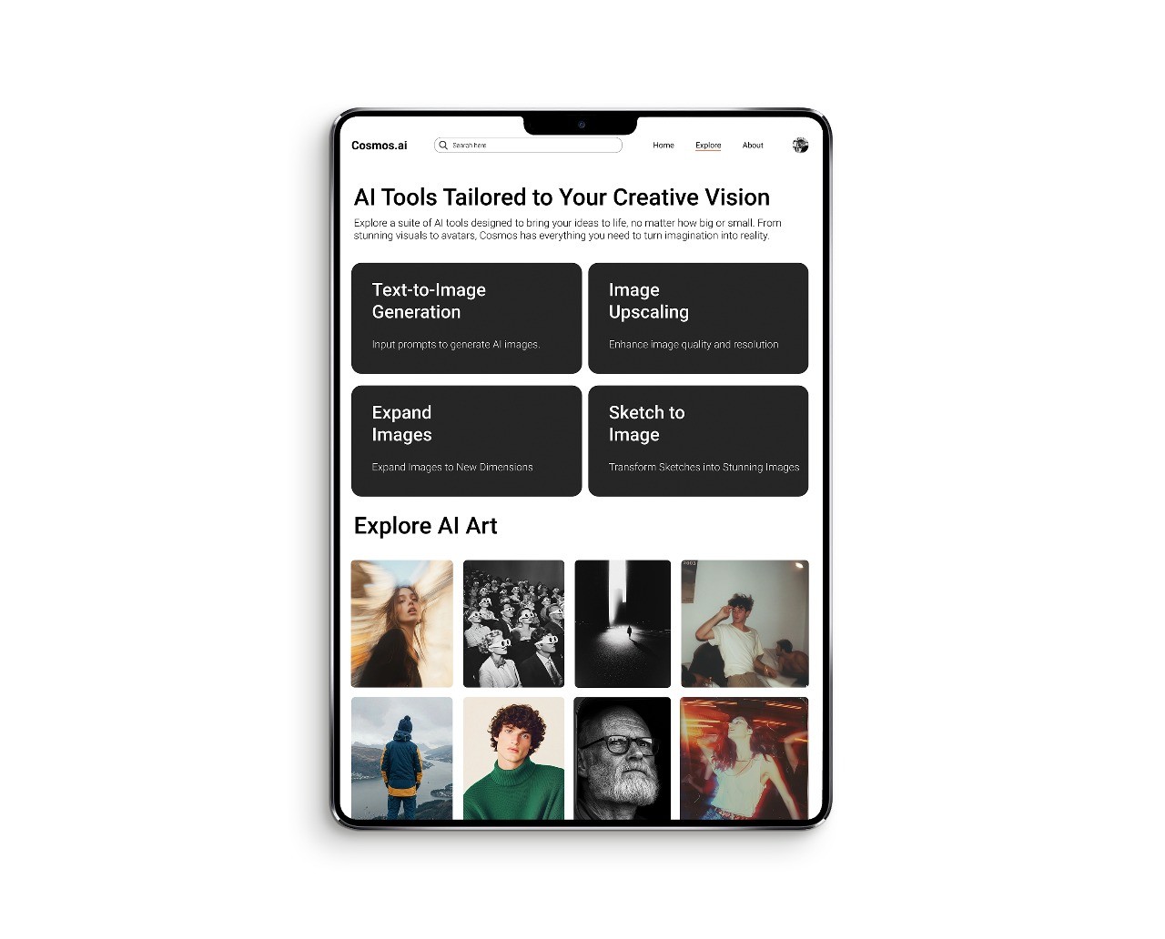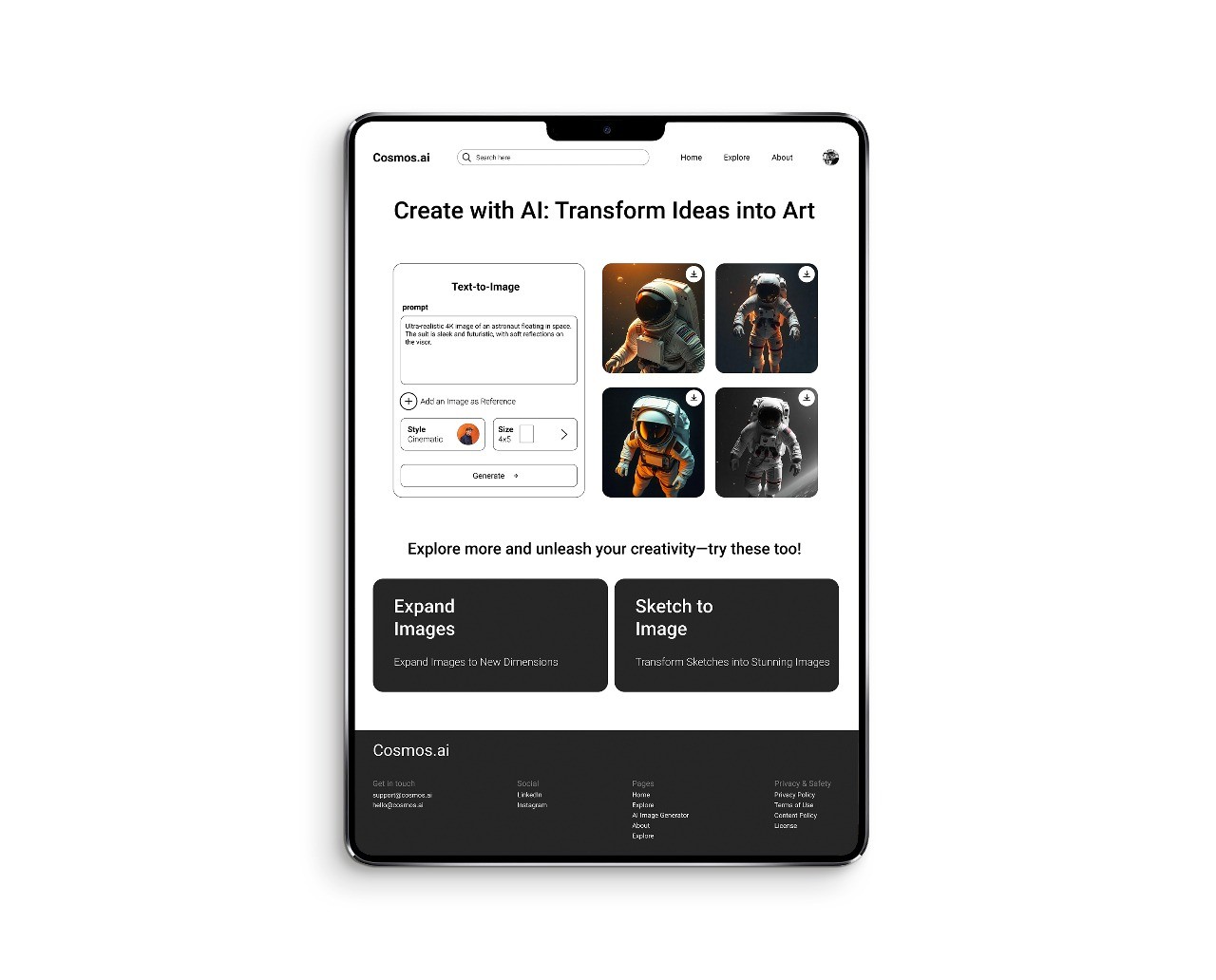 Cosmos.ai is an AI-powered platform for effortless image generation and creative exploration. With a minimal UI/UX, it offers tools like text-to-image, image expansion, and diverse art styles.